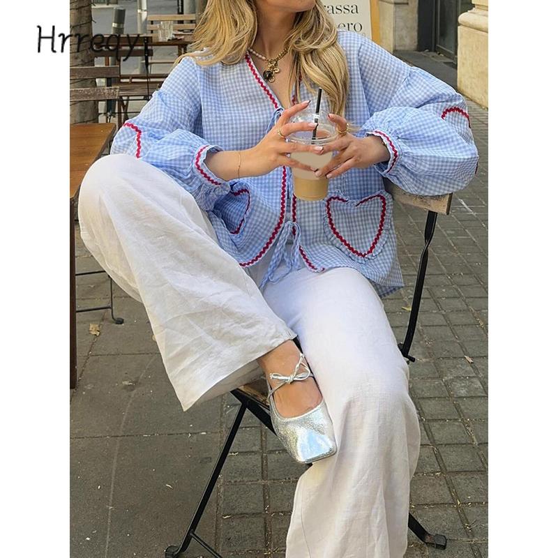 Women Long Sleeve Shirts Heart Embroidery Plaid Front Bowknot Tie-Up Blouses Fashion Spring Summer Casual Tops